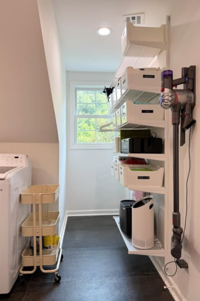 Narrow laundry rooms benefit most from wall-mounted vertical systems like this. Use adjustable rail shelving fixed into studs.