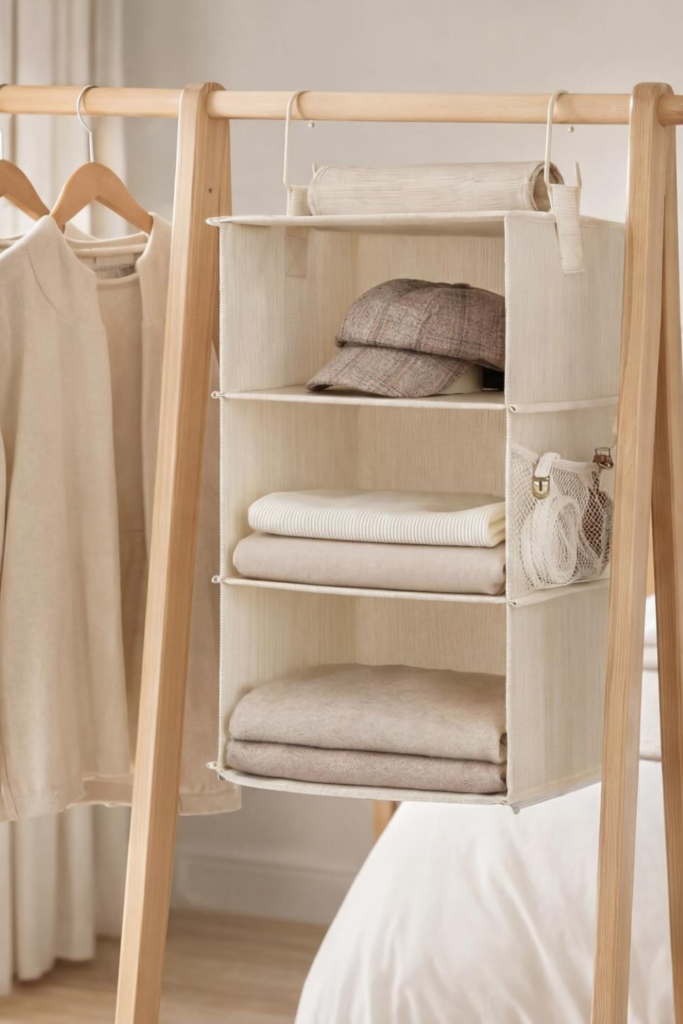 Folded clothes, hats, and accessories stay visible and easy to grab. Use sturdy hanging organizers evenly spaced along the rod.