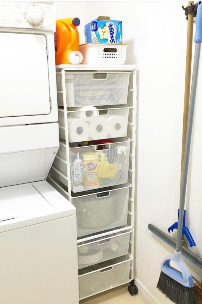 Tight laundry corners become useful when vertical drawers slide into narrow gaps beside machines.