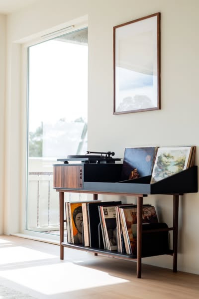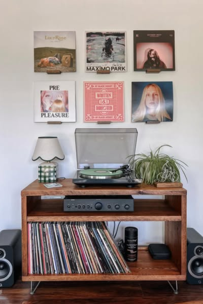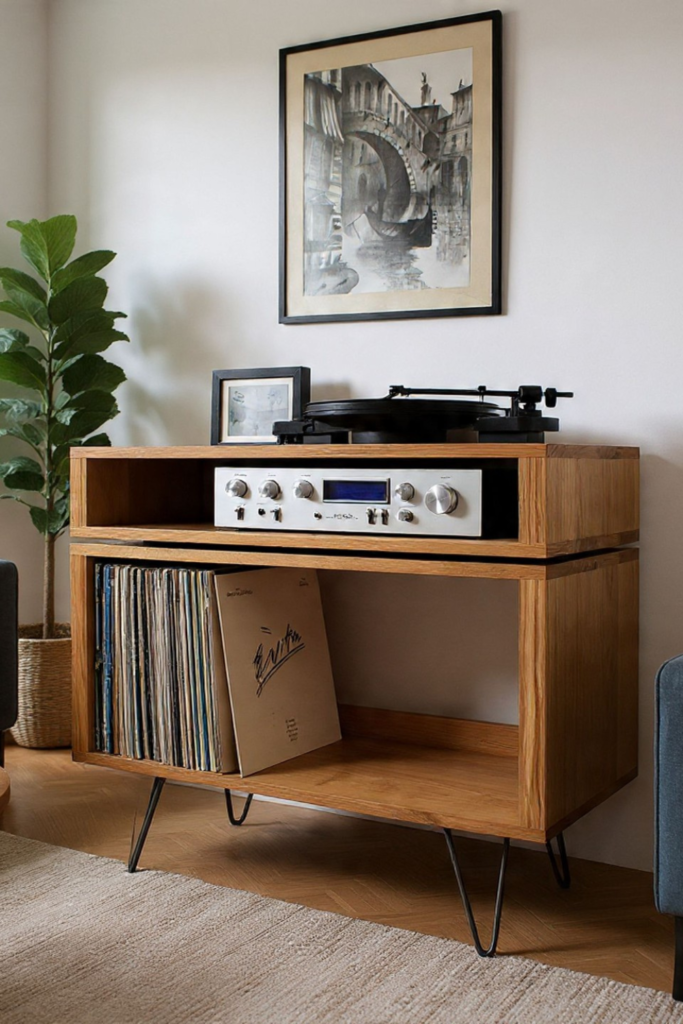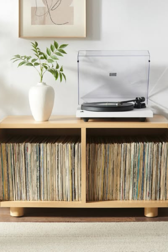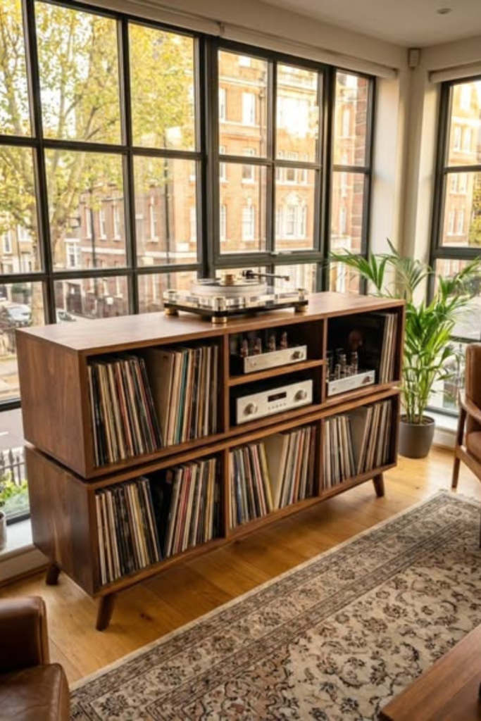Records remain within arm’s reach without dominating the room. Use a compact wooden console with open shelving.
