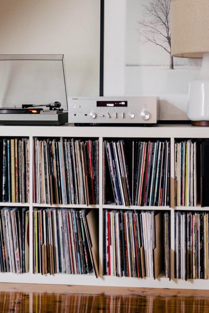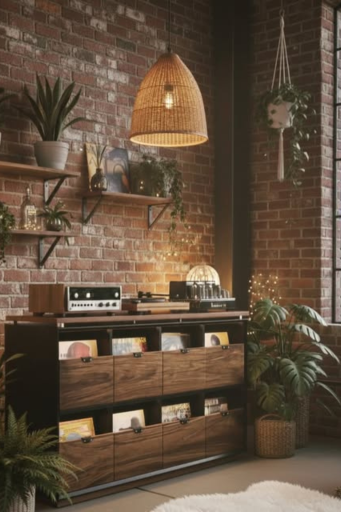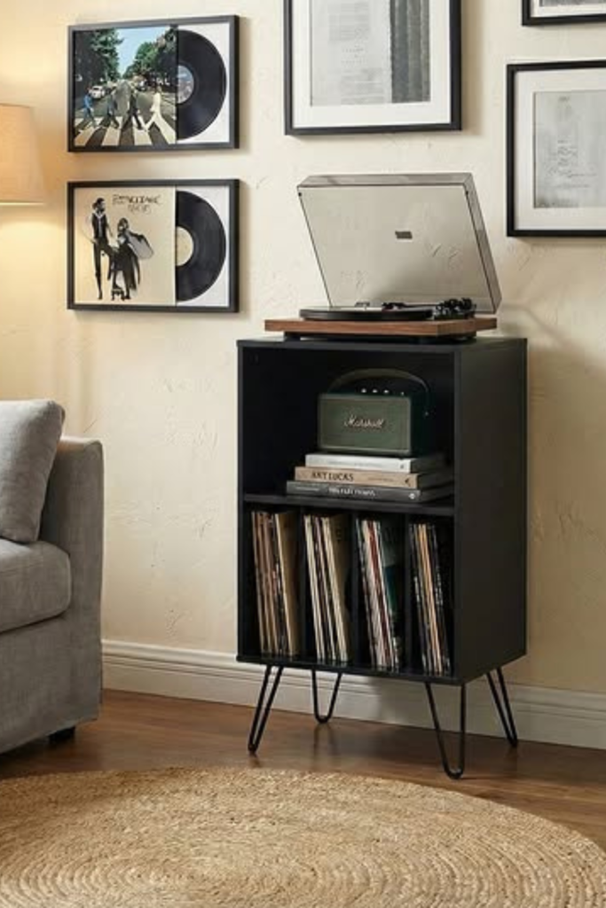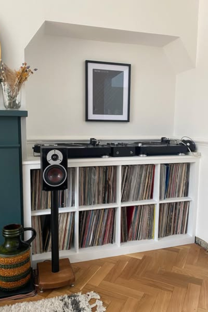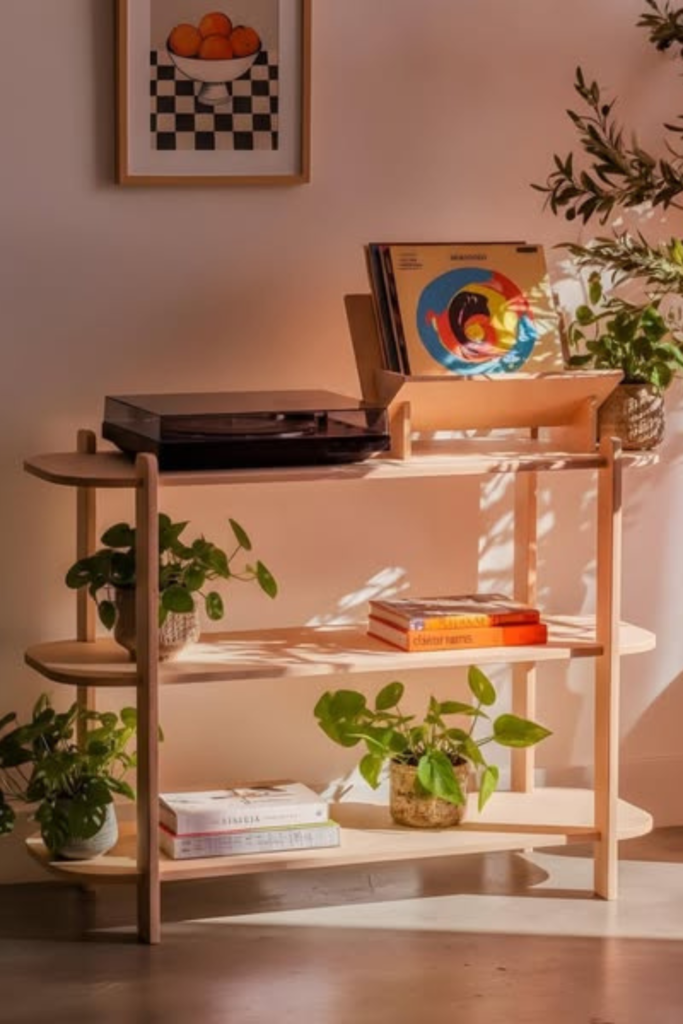 Records remain within arm’s reach without dominating the room. Use a compact wooden console with open shelving.