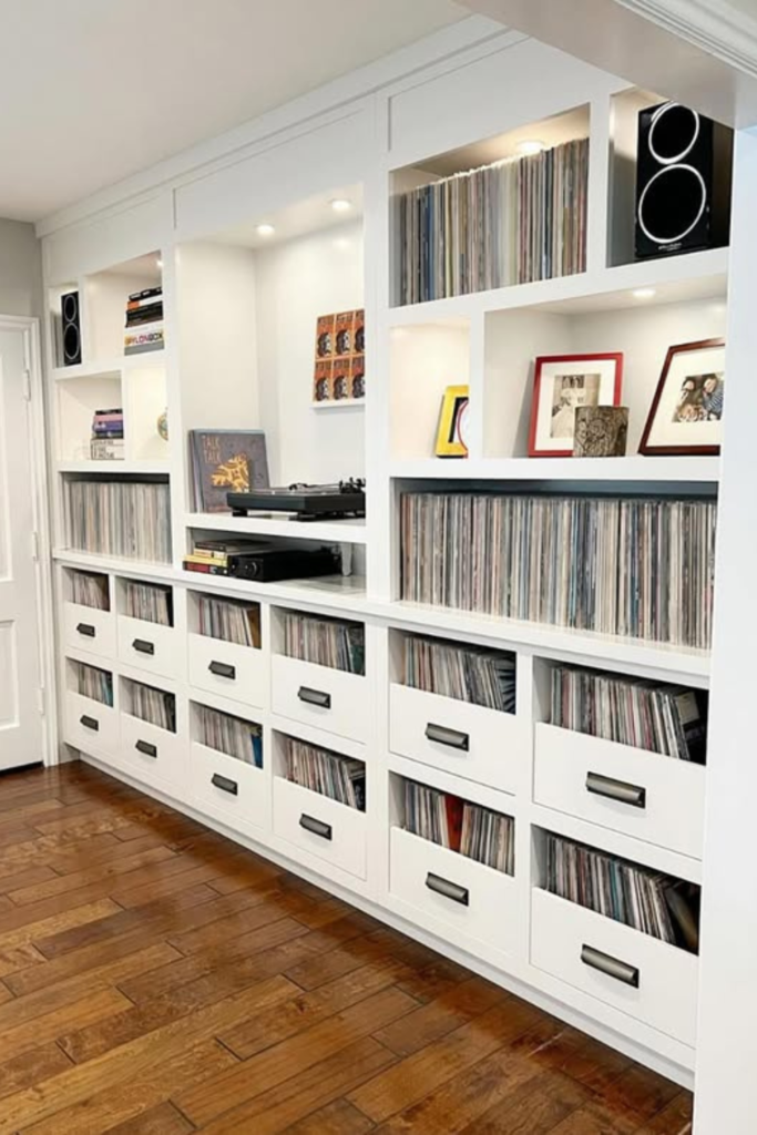 Unused alcoves turn into perfect vinyl zones. Living rooms with fireplaces or recessed walls benefit most, as records stay organized.