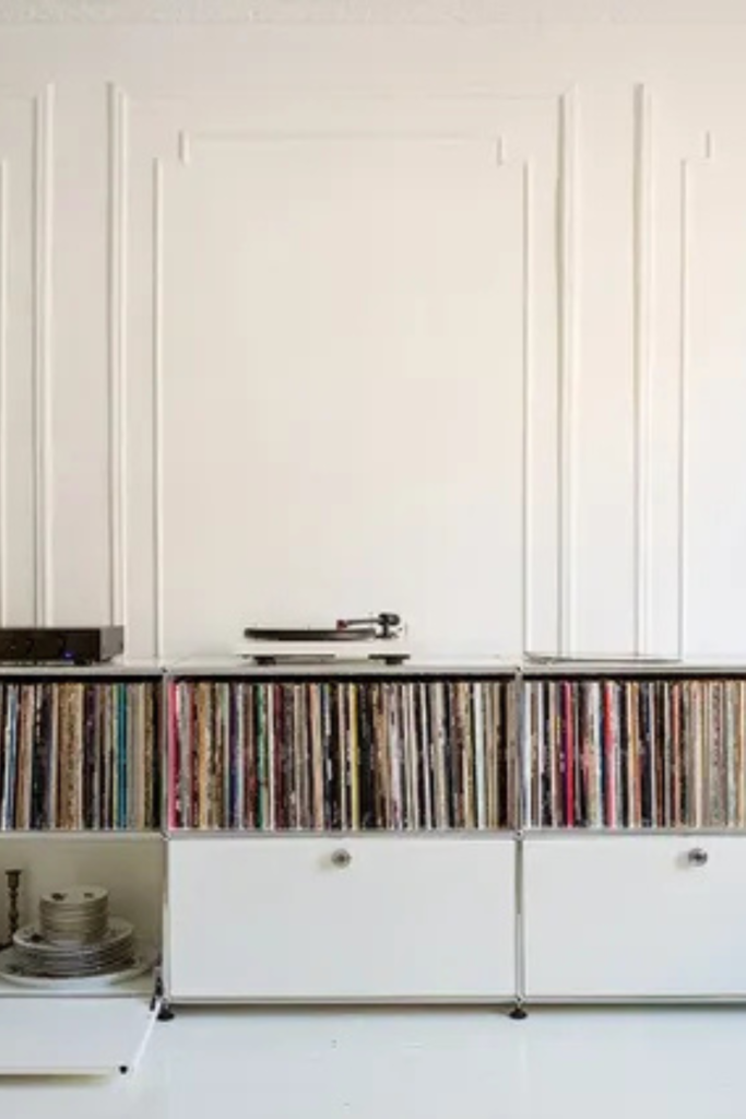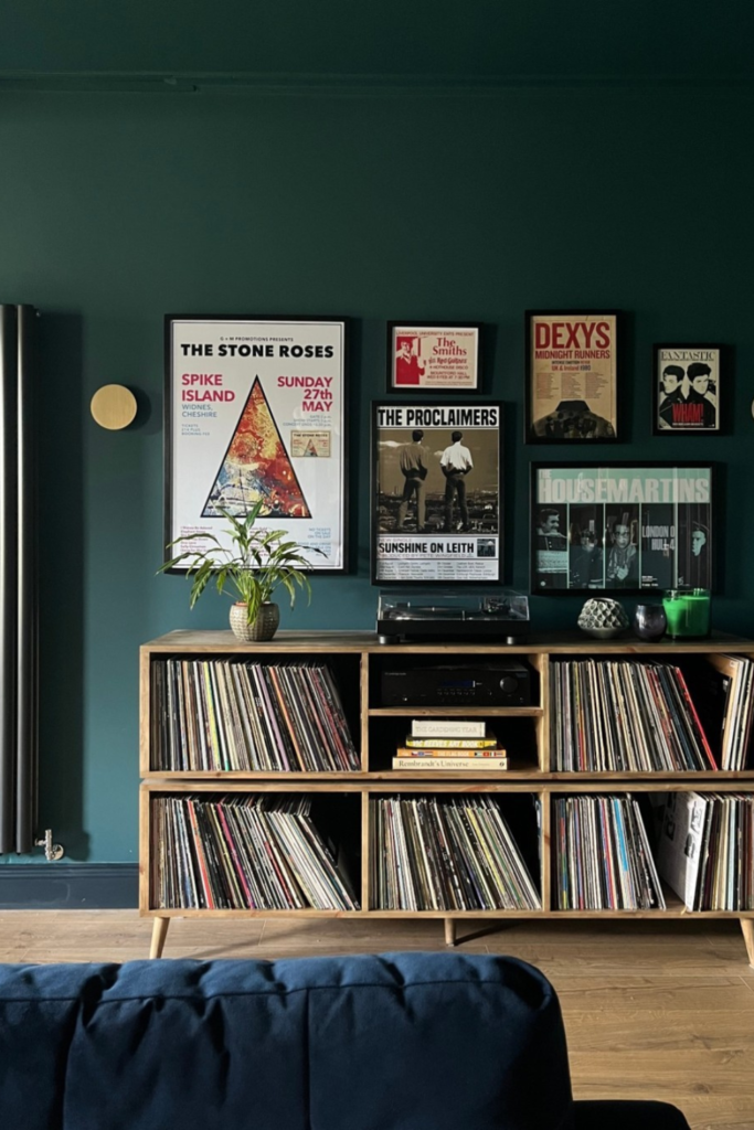 Artwork and records working together turn storage into part of the room’s identity. Music corners and bedrooms suit this idea.