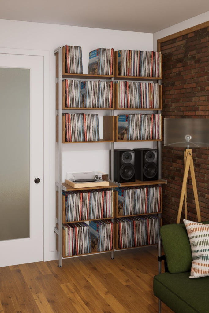 Records stay safest when weight gets evenly distributed, and cube shelving solves that quietly. Use sturdy cube units.