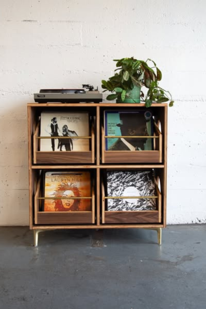 It blends storage with daily use. Recreate it using a solid wood or reinforced media console sized for LP depth.