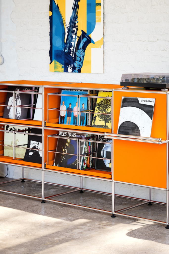Use a low credenza designed for vinyl depth, filling rows. Hidden compartments work for accessories and sleeves.