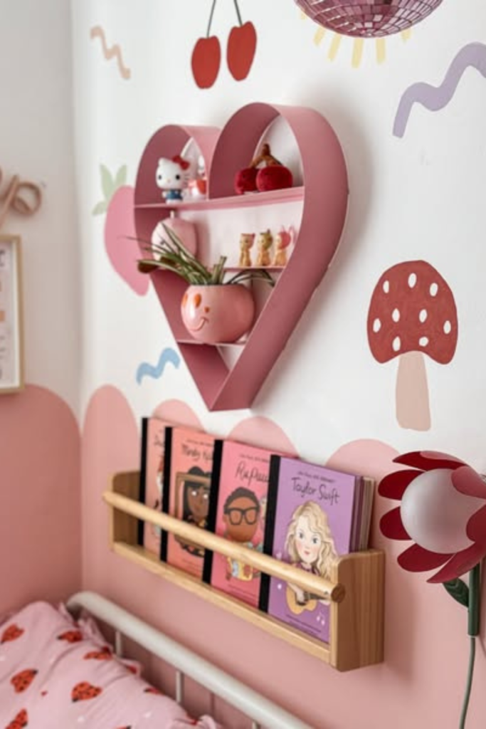 Use a soft-colored hardwood cutout shelf or an MDF shelf. Use simple styling, such as books, plants, or little toys.