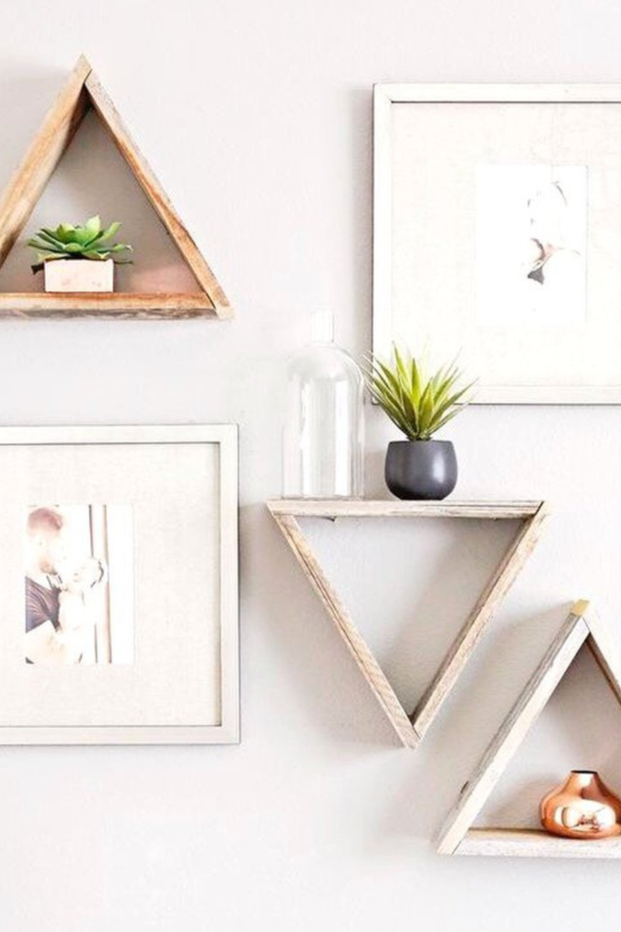 Simple wooden triangular shelves or homemade frames. Just one plant or item per shelf should be placed inside.