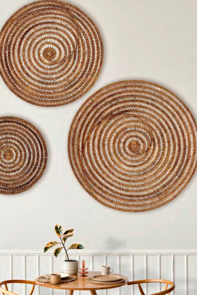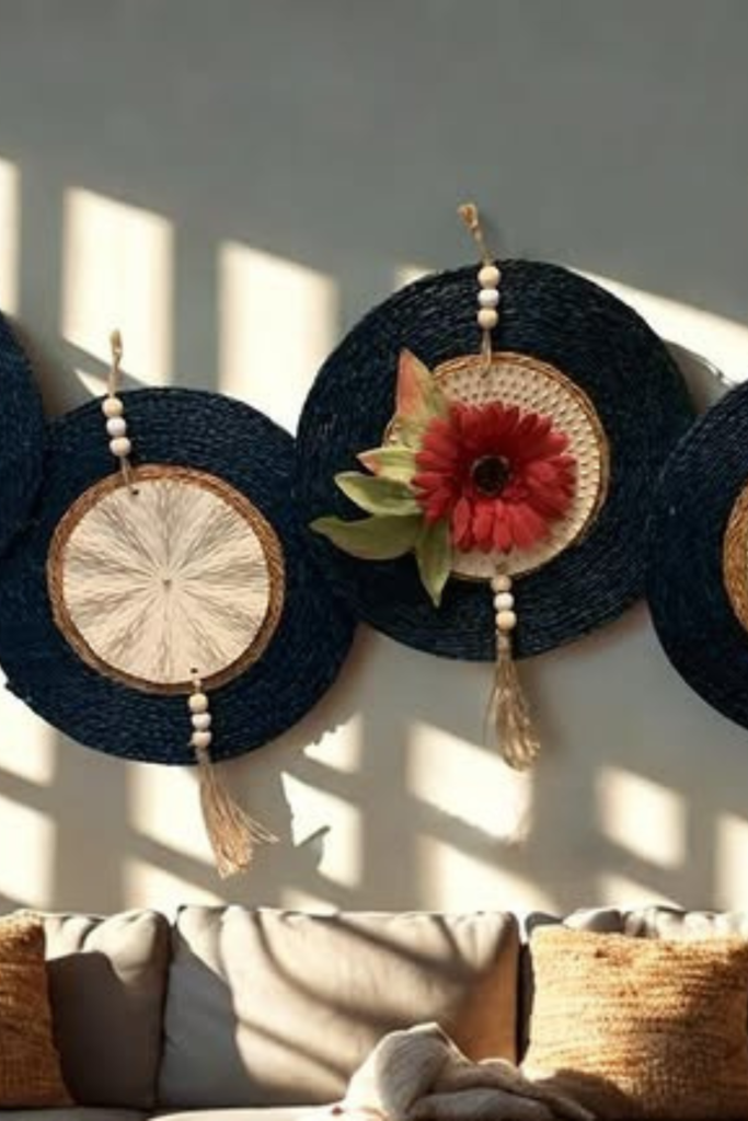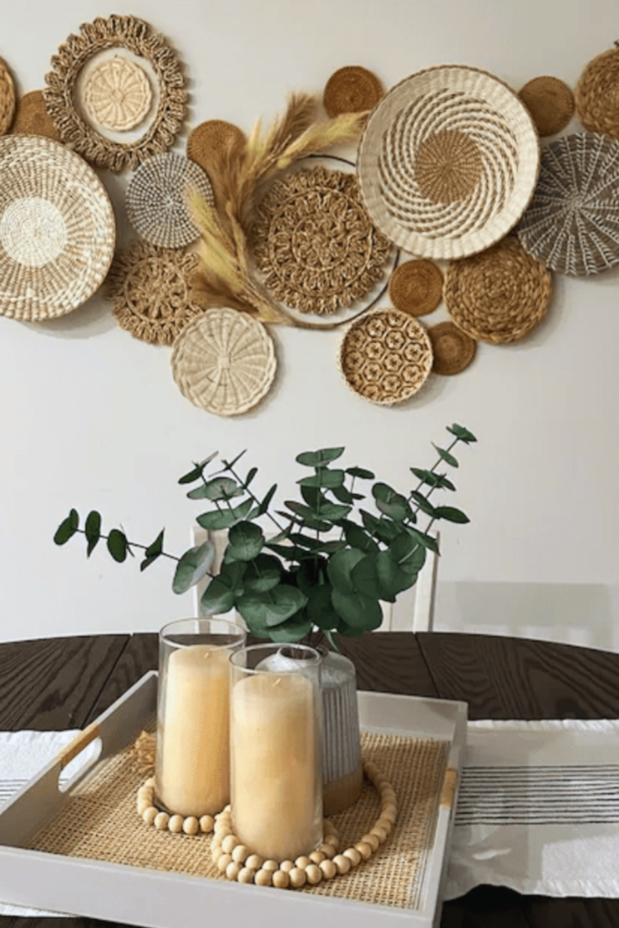You don’t want frames, but your wall feels empty. Use DIY rope circles or woven trays of various sizes. Hang them haphazardly.