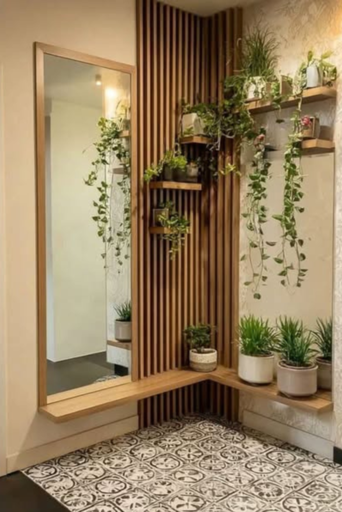 Plants can revitalize a room without painting. Combining floor plants, shelves, and wall-mounted pots.