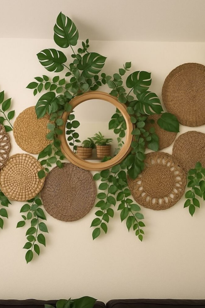 These days, wall art that combines function and texture. Imagine rope art, mirrors covered in plants, fabric panels, basket walls.