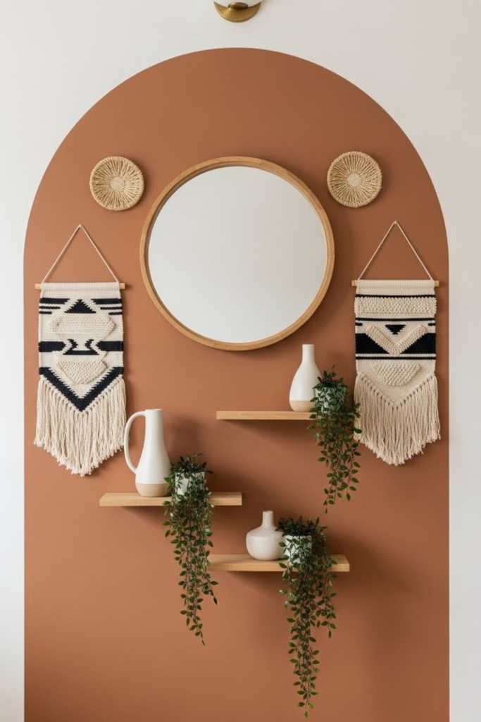 Add handcrafted accents like framed fabric, woven pieces, or tiny plants after starting with a basis like paint, shelves, or panels.