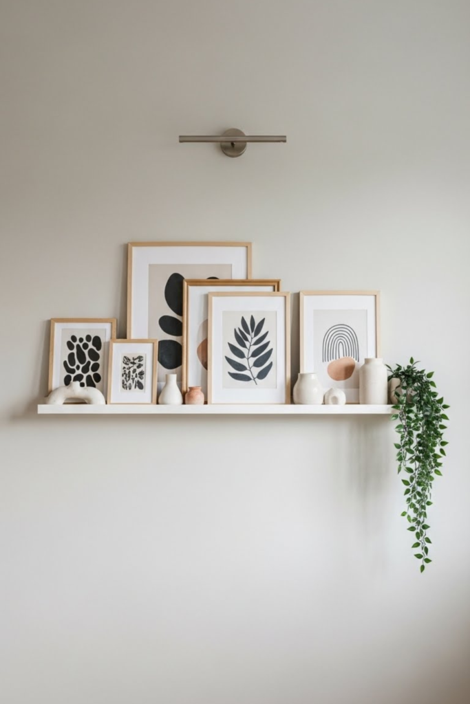 Prevent the ledge from seeming disorganized, keep the frame colors consistent. Here, wall or overhead lighting is sufficient.