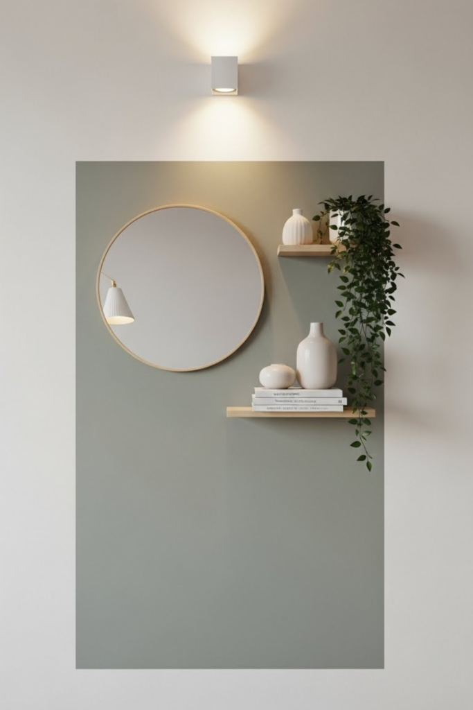 Create a gentle arch with painter’s tape, then fill it in with a subdued hue, keep furniture minimal. Warm bulbs soften it at night.