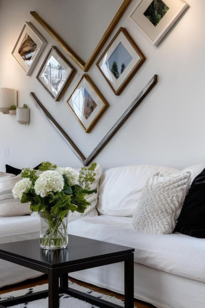 This arrangement quickly provides movement if a standard gallery wall seems overly predictable. Rotating similar frames into a chevron or V form.