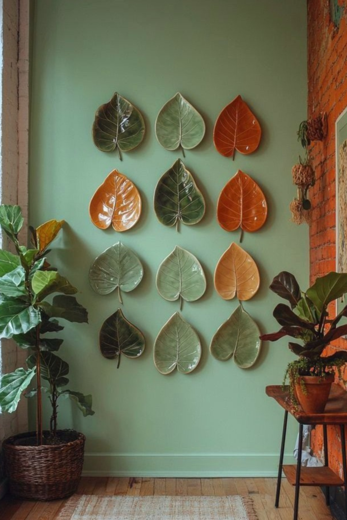 You want a statement wall without frames or art prints. Ceramic, clay, or homemade molded leaf shapes, arranged in a neat grid.
