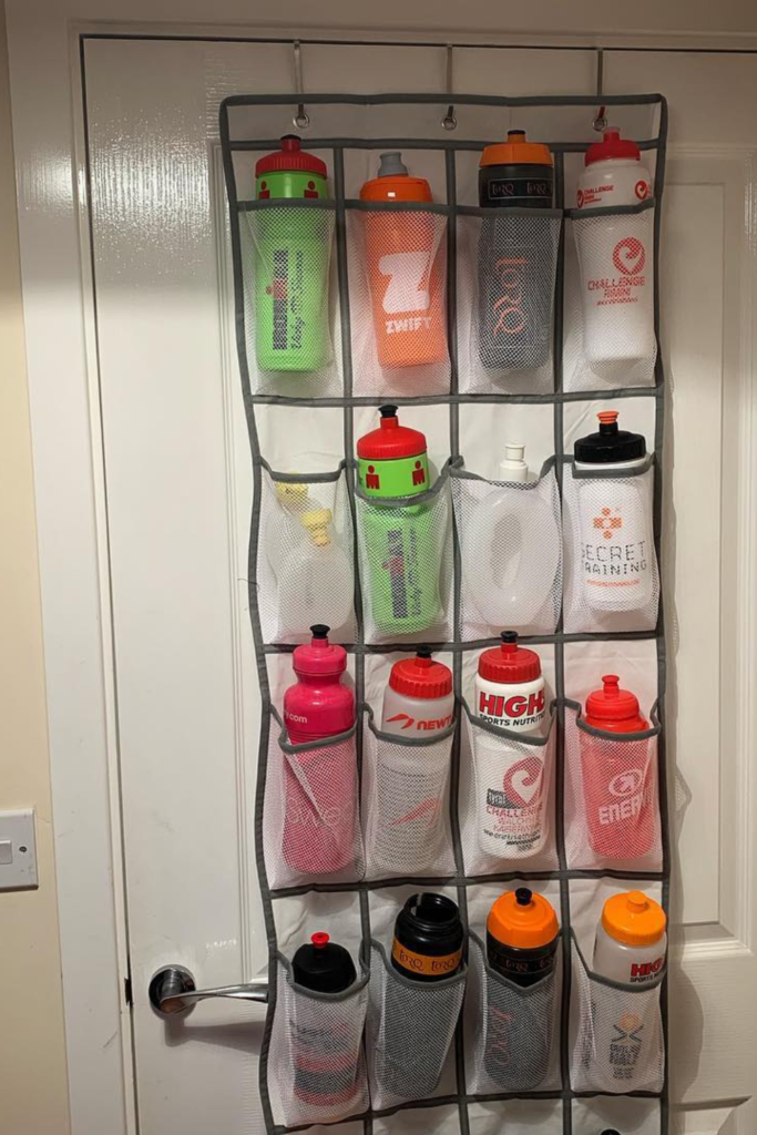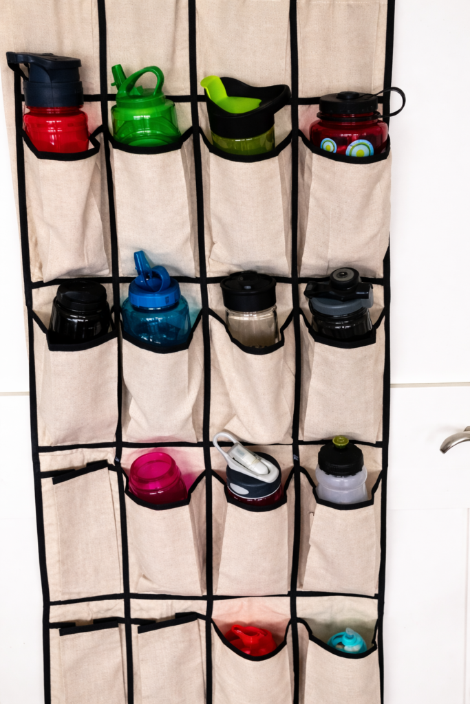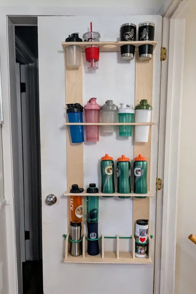 Turning a door into a full sports bottle station keeps every size visible and ready for practice, gym, or school.