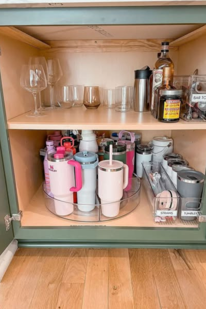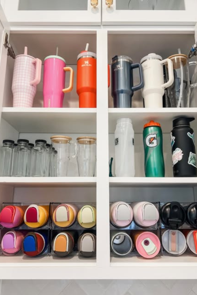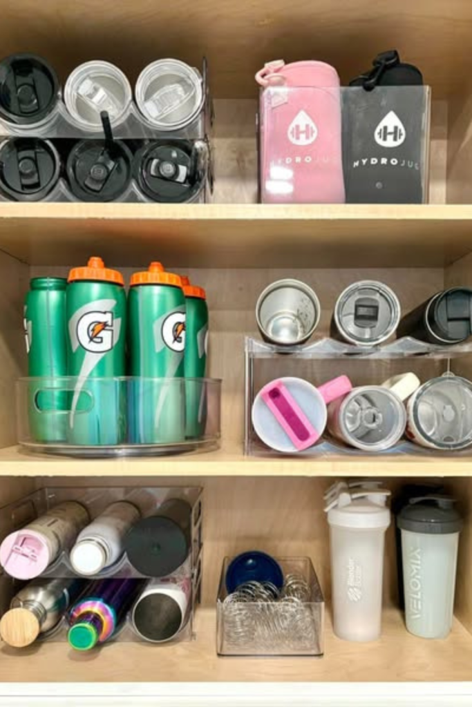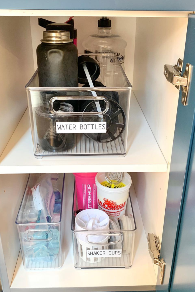 Dedicate one bin to everyday water bottles and another to shaker cups. Clear labeled bins fix that instantly.