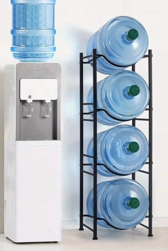 Floor space matters, especially when large water jugs start taking over. Slide each jug horizontally into its own slot to prevent tipping.