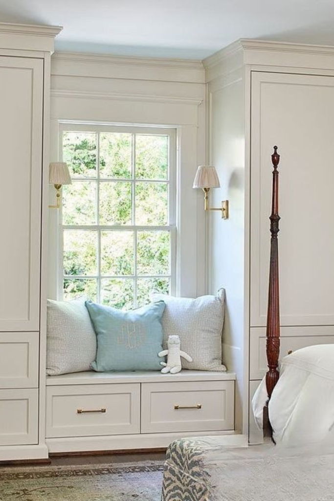 Floor-to-ceiling cabinets turn a simple window into serious storage. Deep drawers under the seat handle clothes, linens, or toys.
