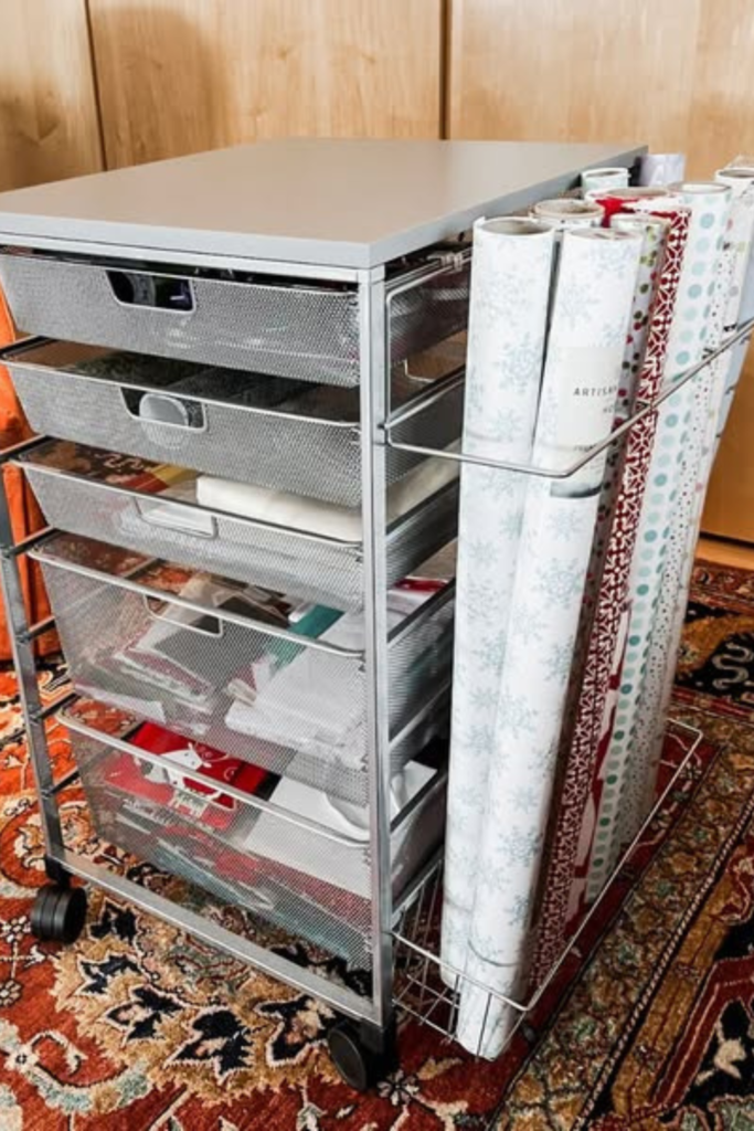 Drawers hold tape, ribbon, and tags in one stop. Parking this setup in a craft room or corner lets you pull it out only when needed.