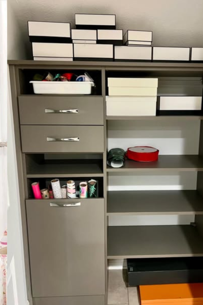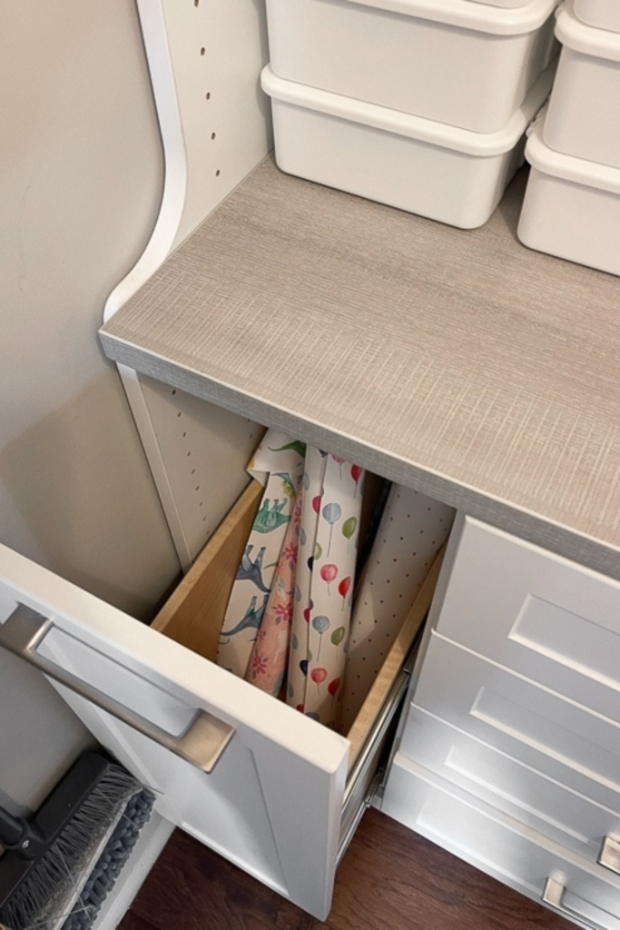 Deep drawers stop wrapping paper from sliding into chaos. Vertical cubbies keep short and half-used rolls standing.