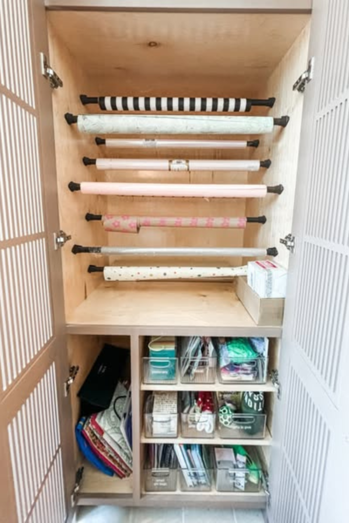 Splitting wrapping supplies into vertical zones keeps everything from collapsing into one pile. Tall baskets handle full rolls up top.