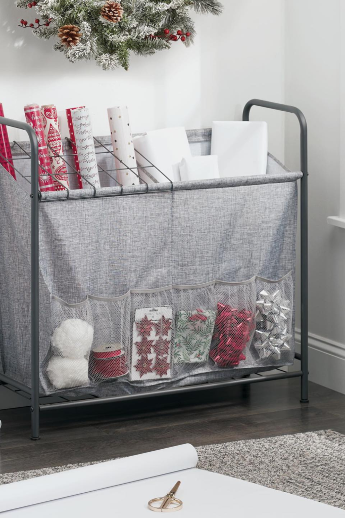 Divided sections stop rolls from tipping, and the lightweight frame makes moving everything simple when the wrapping season ends.