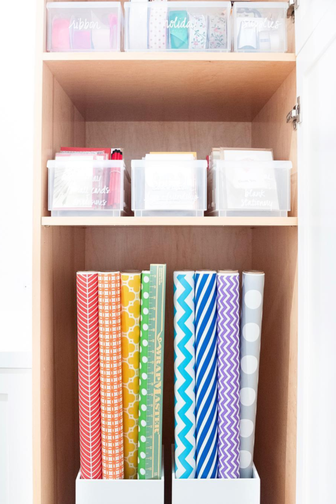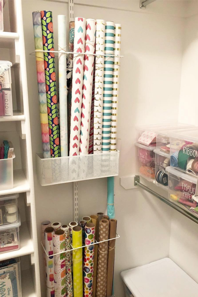Makes everything easier to grab. Pairing paper storage with small bins for tape and ribbon keeps the entire wrapping setup in one place.