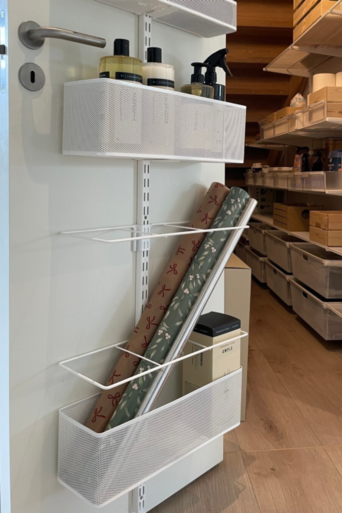 Using the entire door turns dead space into fast, easy to access, organized storage. Tall wire racks hold rolls upright.