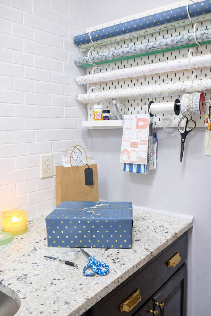 Turning a wall into a working surface keeps wrapping fast and mess-free. Pegboards hold rolls horizontally.
