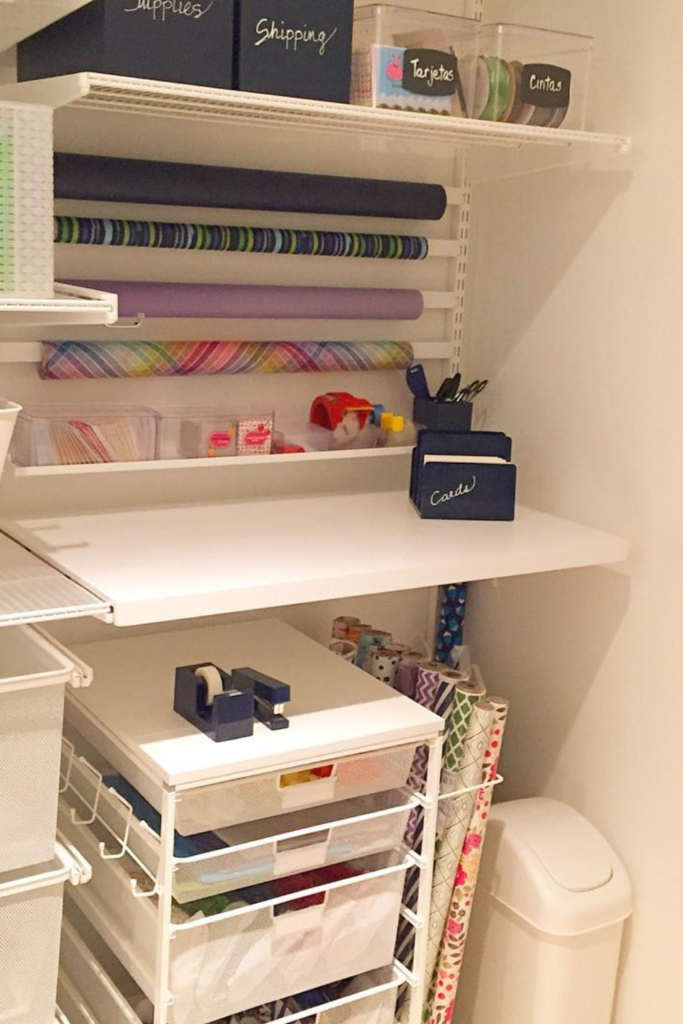 Dedicated shelving turns wrapping into a grab-and-go task instead of a hunt. Horizontal rods keep rolls supported.