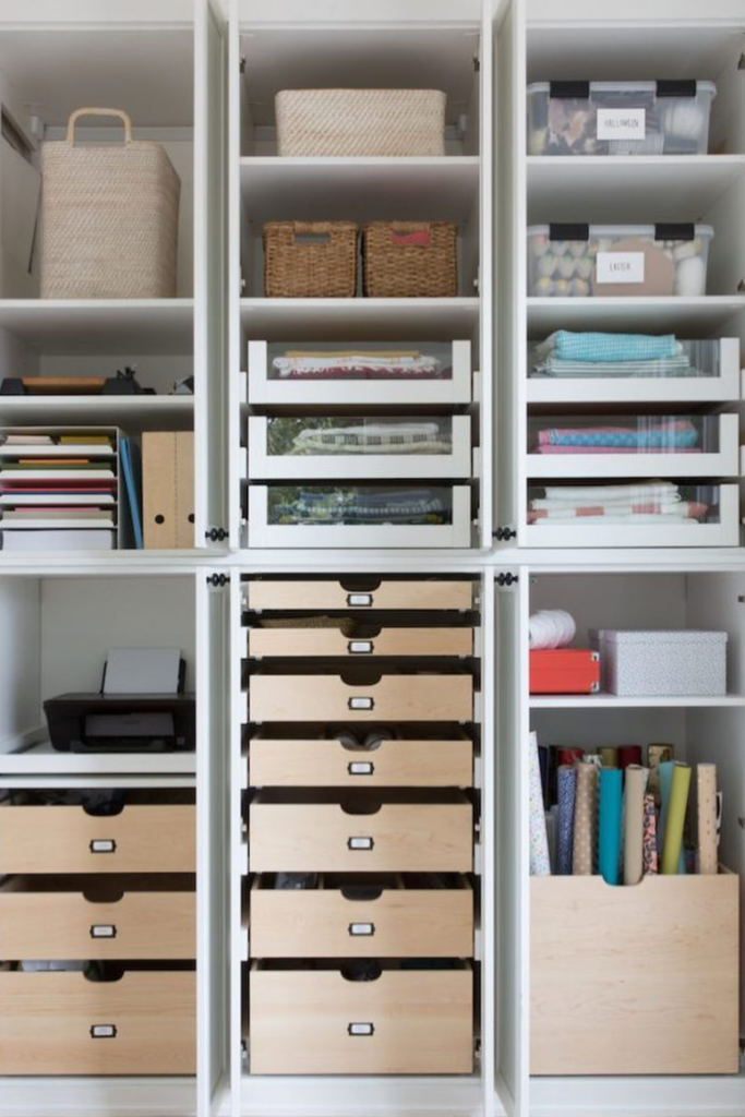 Built-in cabinets work best when wrapping supplies that need to disappear completely, tall lower compartments.